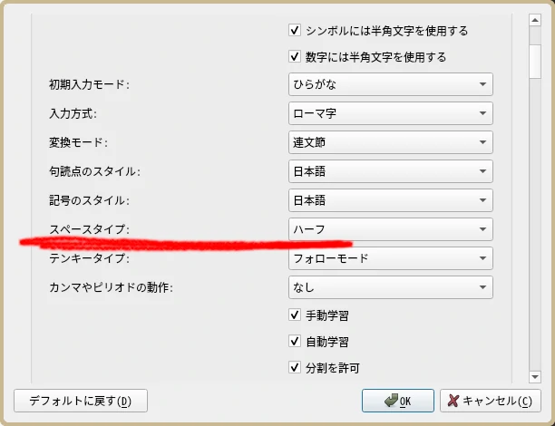 - [全般] > [スペースタイプ]: ハーフ (常に半角スペースを使う) (図 4)