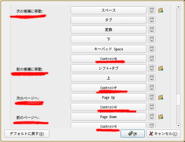 - 同様にして [前の候補に移動]、[次のページへ]、[前のページへ] にそれぞれ Ctrl + P、Ctrl + U、Ctrl + V をアサインする (図 5)。