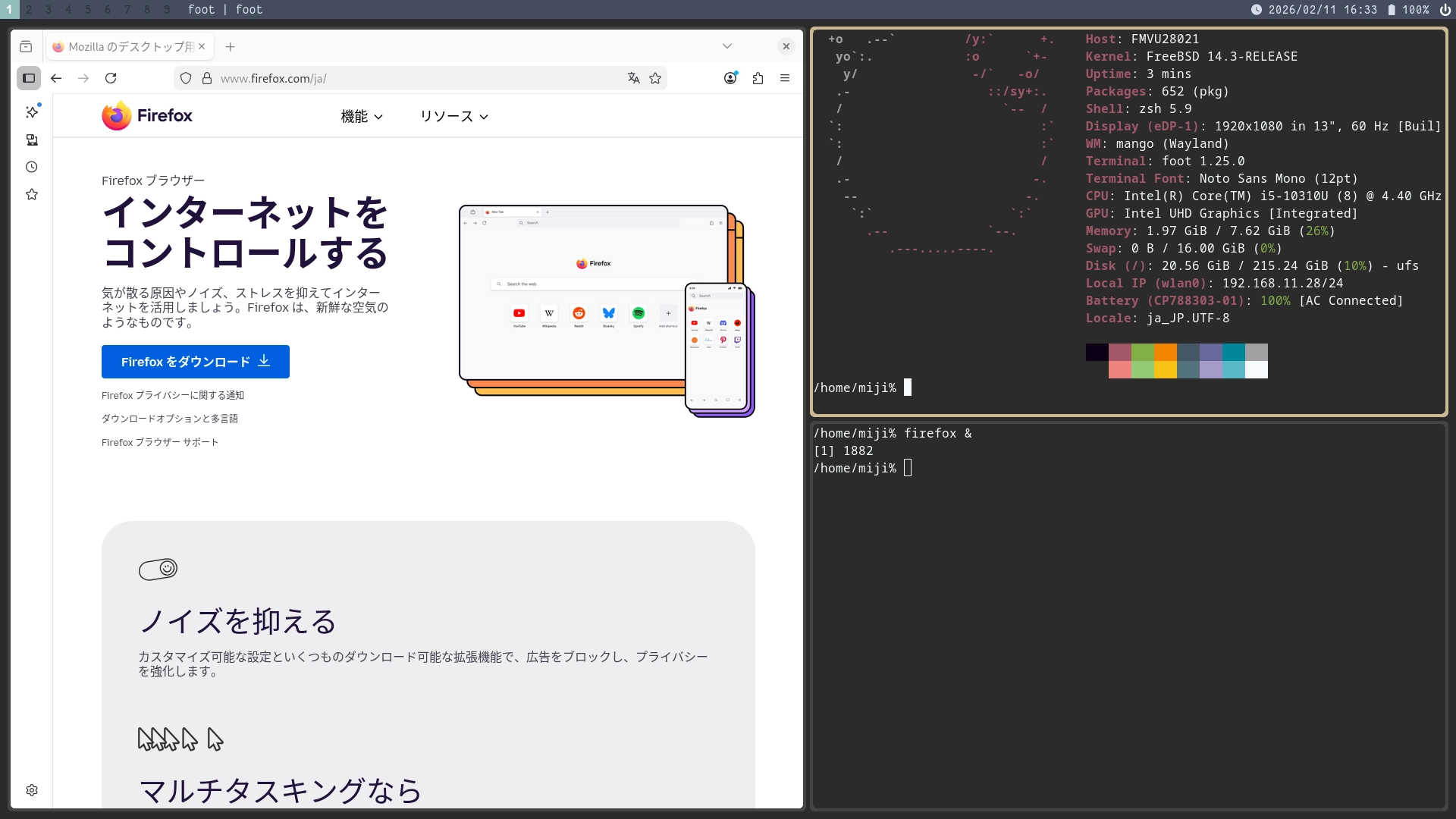 FreeBSD 14.3 をインストールする (その 4): MangoWC / foot / Waybar / Fcitx5 / Anthy / Firefox