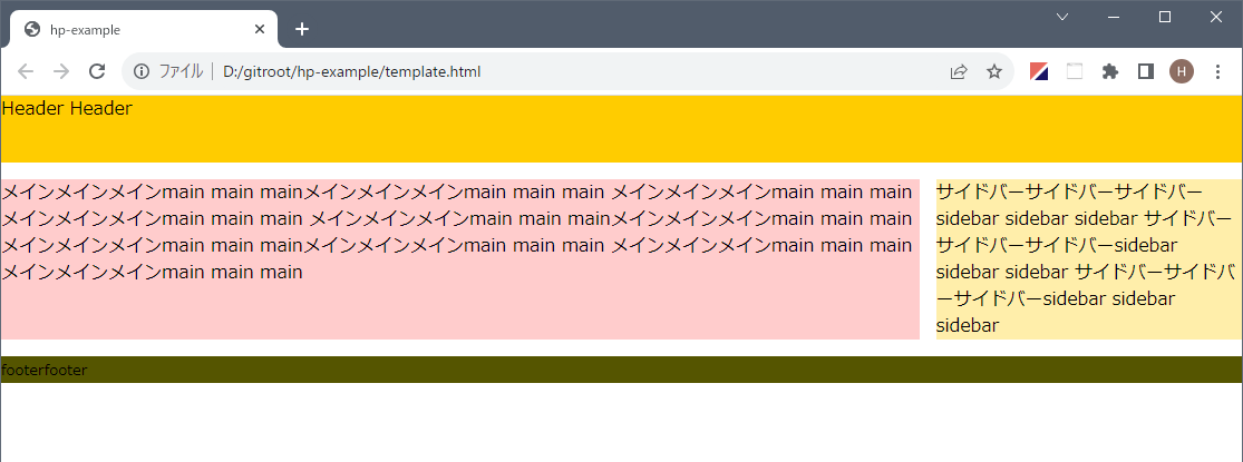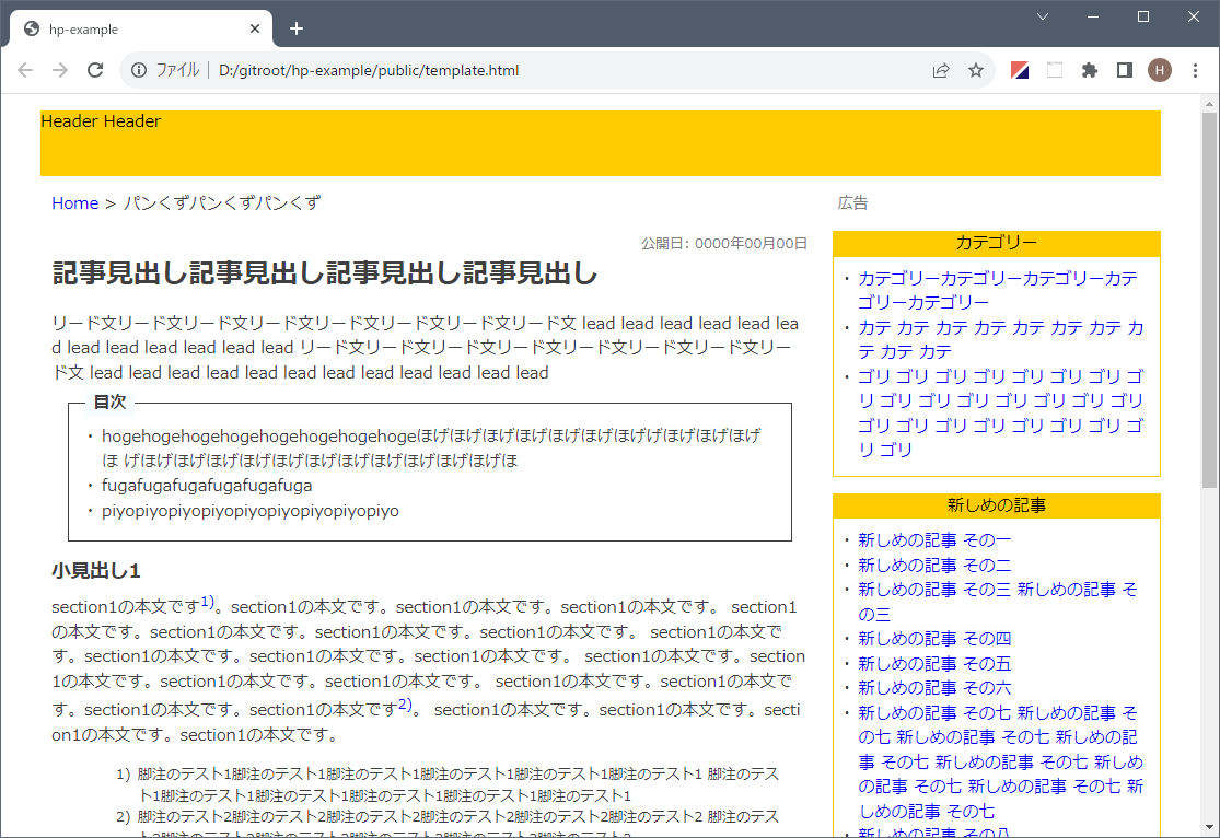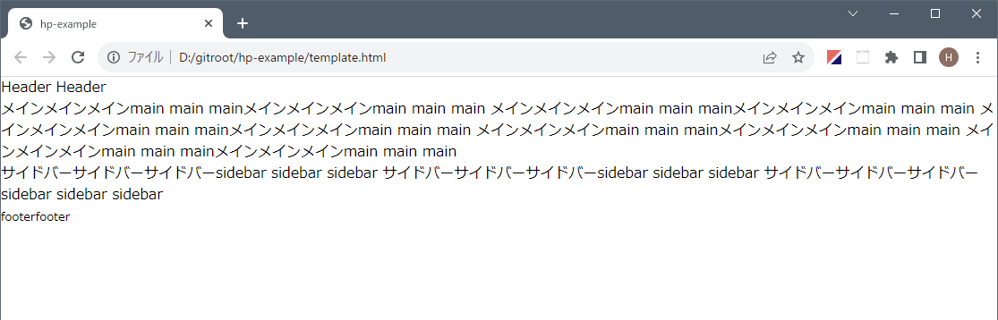 これにより css ディレクトリの下に style.css が生成されます。そうしたらブラウザで template.html を開いてみましょう。図 3 のようになります。ちょっとだけ最終イメージに近づきました。