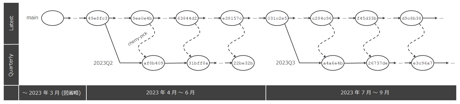 ところで、上にも述べたように、Quarterly ブランチは四半期ごと (毎年 1、4、7、10 月) に main ブランチから枝分かれして 2023Q1、2023Q2、2023Q3、... というように名前が与えられます。新しい Quarterly ブランチが作成されると、それまで使われていた古い Quarterly ブランチはその時点で更新がストップします。というわけで四半期ごとに次のようにして新しいブランチに切り替える必要があり、ちょっと面倒ではあります。