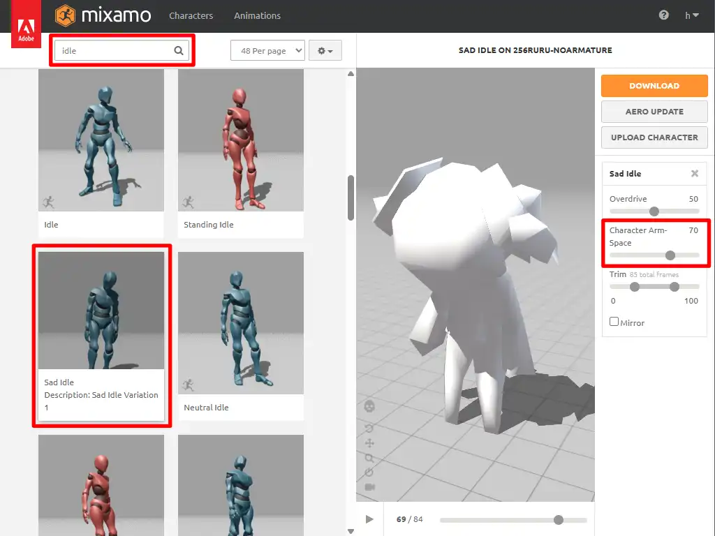 - 検索欄に "idle" と入力するといろんな待機状態のアニメーションが表示されるので、好きなのを選んでクリックする。ここでは Sad Idle (Description: Sad Idle Variation 1) を選択 (図 9)。