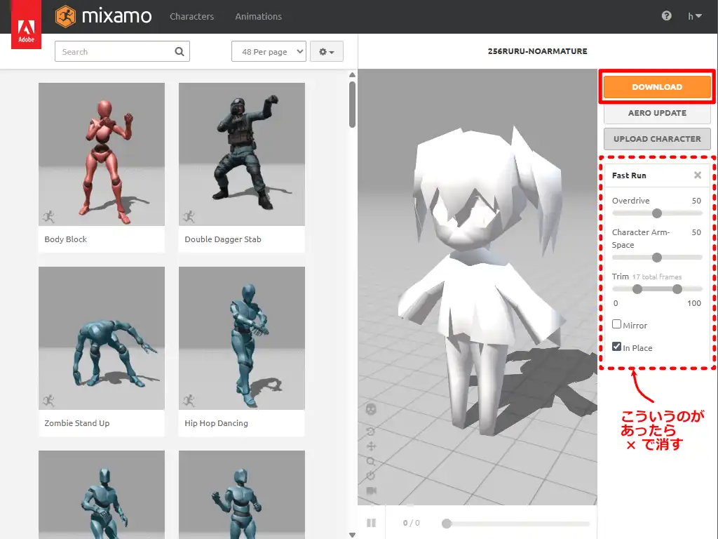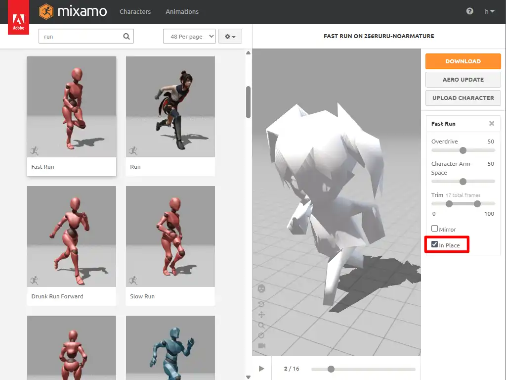 こんな調子で他のアニメーションもダウンロードしていきます。注意点その2として、走る系のアニメーションに多いみたいなんですが、「In Place」というオプションがある場合があります (図 11)。これを ON にしておかないと、ゲームエンジン等にインポートしたときに、いきなり走り始めてはるかかなたに消え去ってしまうみたいです (未確認)。