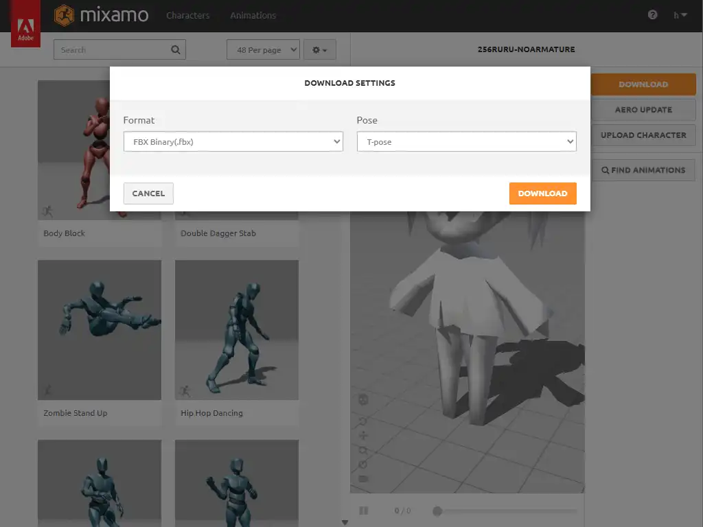 あとは回し蹴りなりジャンプなり、モデルに取らせたいアニメーションを選んで、同じように .fbx ファイルをダウンロードします。注意点として、ダウンロード時の設定で「Without Skin」を選びます。スキンというのは文字通りモデル本体の表面、つまり容姿です。T-pose は With Skin です。これに対して単なるアニメーションの場合は、骨格だけあればいいので Without Skin です。これ以降ダウンロードするファイルはすべて Without Skin を選びます。