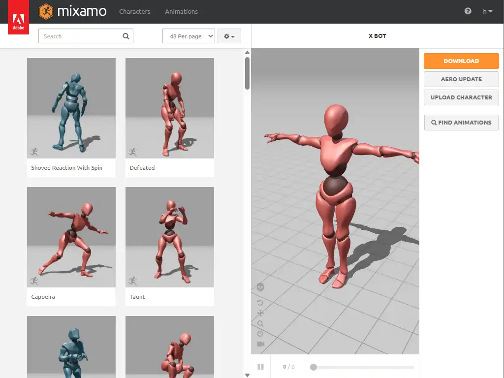 ここからいよいよ Godot Engine にインポートするためのファイルを何個かゲットしていきます。最初は T-pose です。T-pose というのは、映画『タイタニック』で、タイタニック号の船首においてレオナルド・ディカプリオに抱えられながらケイト・ウィンスレットがとっていたポーズのことです (誤解のないように言っておきますが、「T」はタイタニックの「T」ではなくて、とっているポーズがアルファベットの「T」みたいだから T-pose ってことです)。つまりこれが基本姿勢になるってことです。