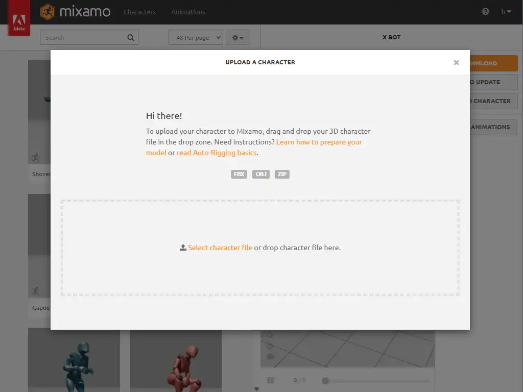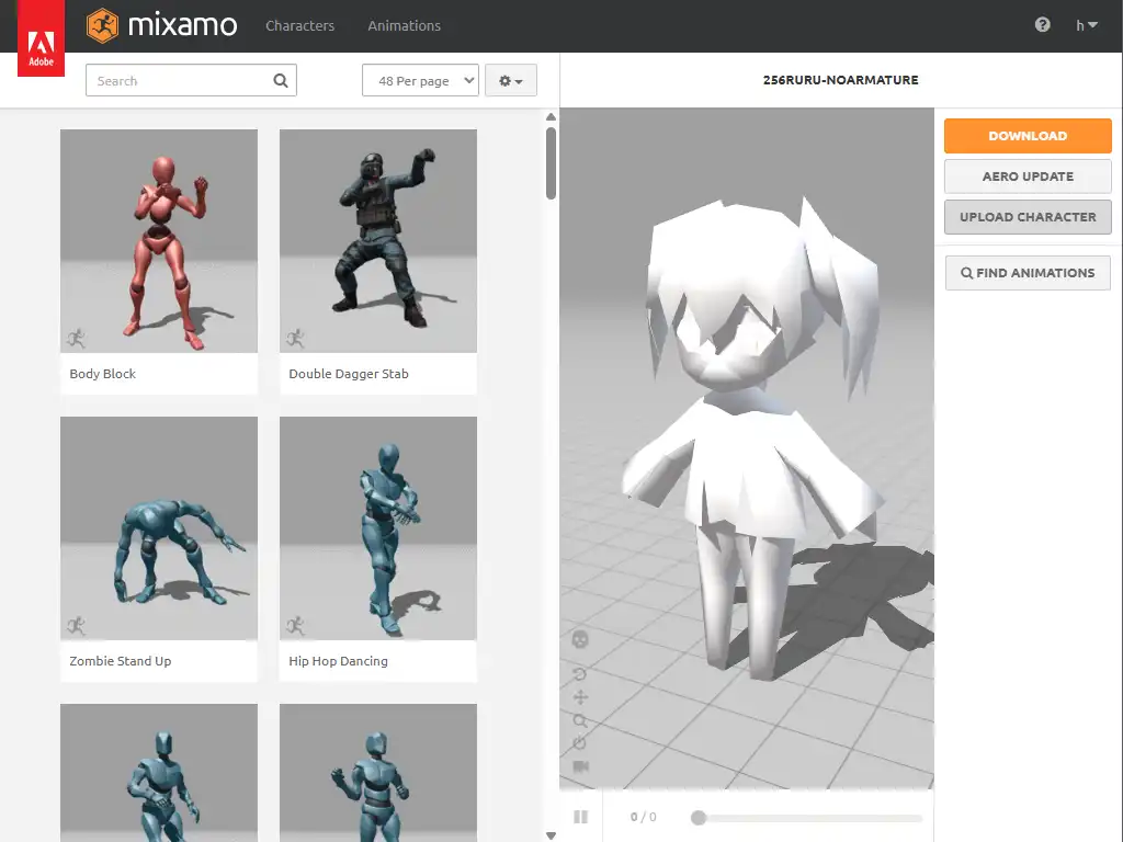 前回 Blender で作った 256Ruru-NoArmature.fbx を Mixamo にアップロードします。