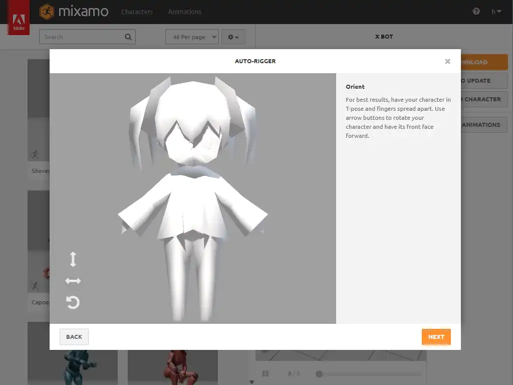 - AUTO-RIGGER の画面になる (図 3)。ここではキャラクターがこちらを向くようになっていたほうがいいみたいなので、こちらを向いていなかったら左下の矢印アイコンを使って向かせる。