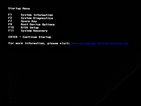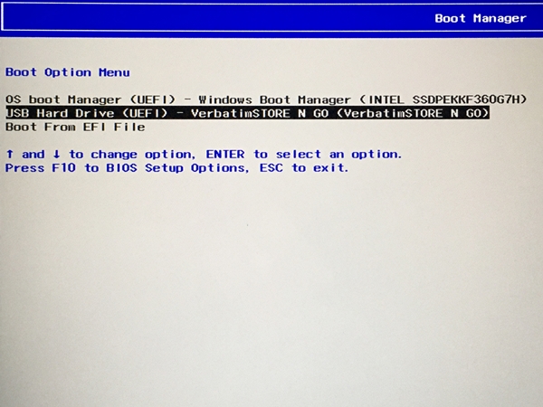 - レスキューメディアとバックアップデータ保存用ハードディスクを挿してパソコンを起動する。ヒューレット・パッカード SPECTRE の場合、電源オン時に ESC キーを押し続けると図 4 のようなメニューになるので、F9 キーで [Boot Device Options] を選択し、Boot Manager 画面 (図 5) にてレスキューメディアが入った USB メモリを選択する。