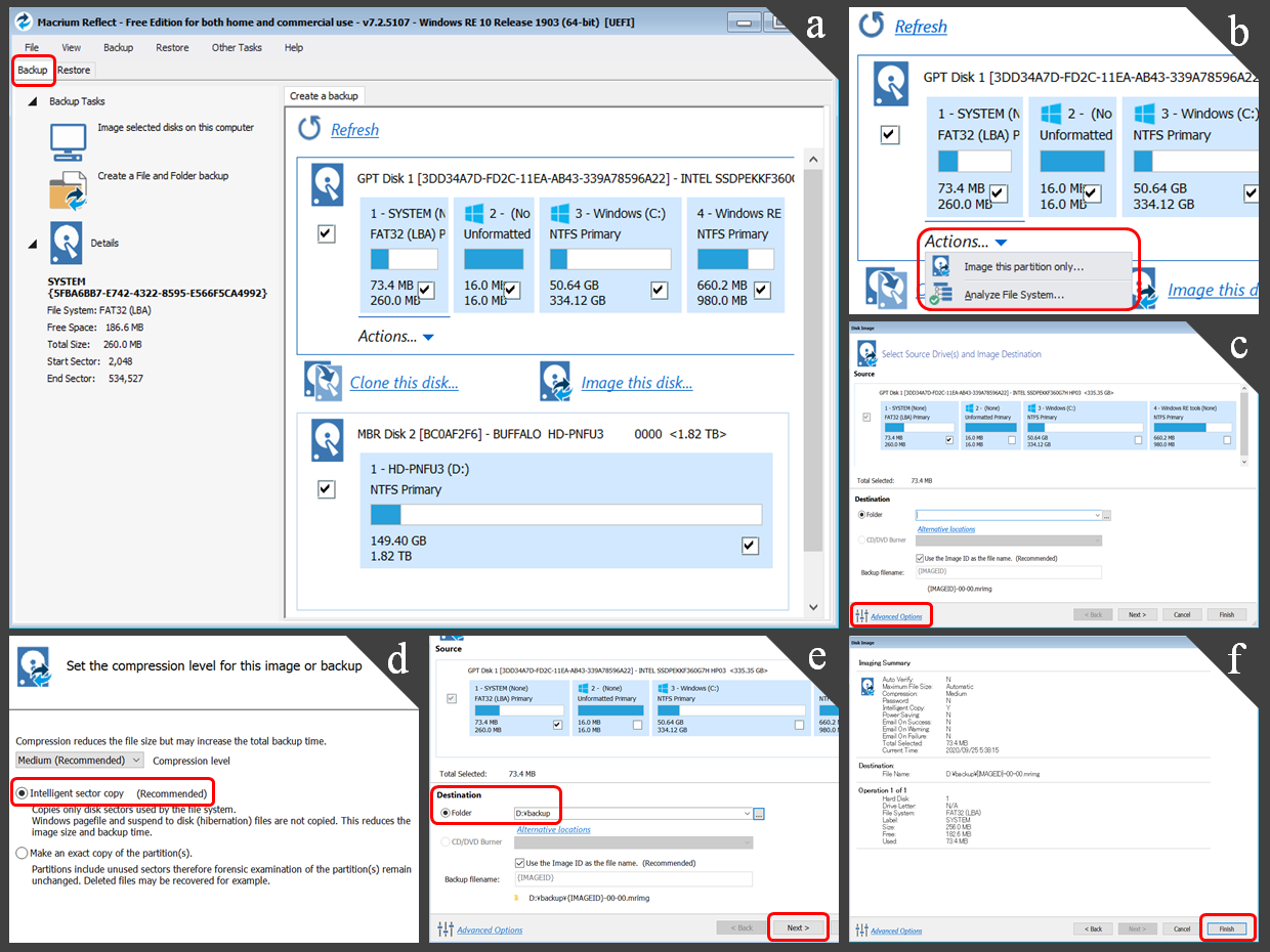 - Advanced Settings 画面が表示される (図 6(d))。[Compression] タブの [Intelligent sector copy] をオンにする (デフォルトでオンになっている)。