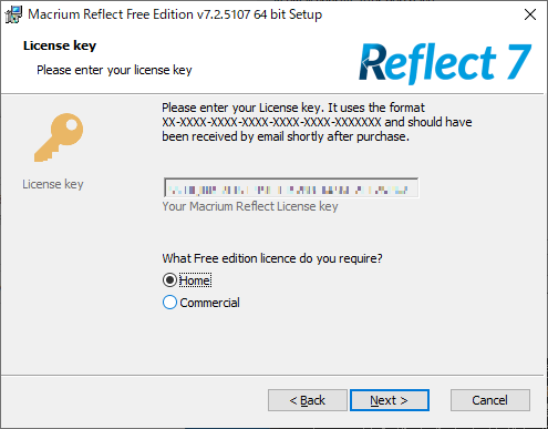 - インストーラを実行する。基本的に画面の指示に従う。途中、ライセンスキーを入力する欄は自動で入力されている。Free Edition のみかも (図 2)。E メールアドレスを登録する欄は、[Register this installation of Macrium Reflect?] のチェックを外すと未入力でも次に進める (図 3)。