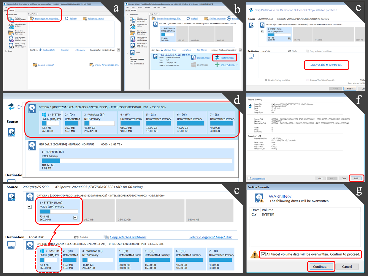 - 上書きしてよいか訊かれるので、「All target volume data will be...」にチェックを入れて [Continue] をクリックする (図 7(g))。リストア処理が始まる。