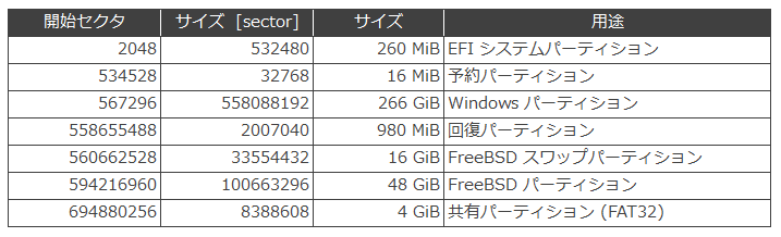 FreeBSD 用のパーティション (nvd0p5,p6) を含め、すべてのパーティションのタイプに ms-basic-data を指定していますが、あとで変更するので問題ありません。むしろここで freebsd-swap や freebsd-ufs などを指定してしまうと、あとで FreeBSD をインストールするときに「パーティションの上書きができません」というようなメッセージが表示されて先に進めなくなる現象が見られたので2)、いろいろ試した結果このようにしています。