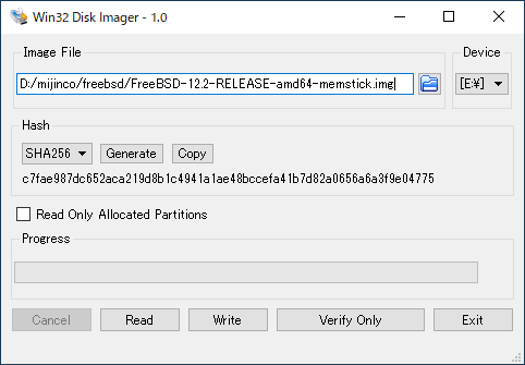 FreeBSD のインストールメディアを作る方法はいろいろあると思いますが、ここでは Windows 上で Win32 Disk Imager というソフトを使用します。ソフトをインストールし、起動したら [Image File] 欄で FreeBSD-<バージョン>-RELEASE-amd64-memstick.img を選択し、[Device] 欄で書き込み先 USB メモリのドライブレターを選択します。[Hash] 欄でアルゴリズムを選択して [Generate] ボタンを押すとイメージファイルのハッシュ値を表示させることができます。[Write] ボタンを押すと、USB メモリへの書き込みが始まり、「Write Successful.」と表示されたら完成です。