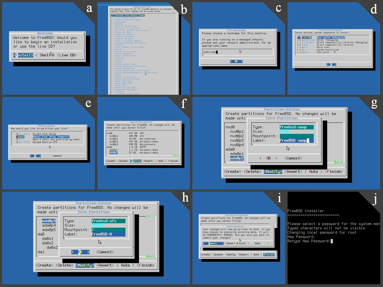 ※ ここで指定したラベルは、あとで rEFInd の設定を書くときに使用する。Type: freebsd-ufs Size: (自動入力) Mountpoint: / Label: FreeBSD-A - 以上、入力を終えて [Finish] を選択すると、本当にディスクを消去してよいか訊かれる (図 1(i))。よければ [Commit] を選択するとインストールが始まる。よくなければ [Revert & Exit] または [Back] を選択する (どこに戻るんだったか忘れましたが、とにかくどこかに戻ります)。