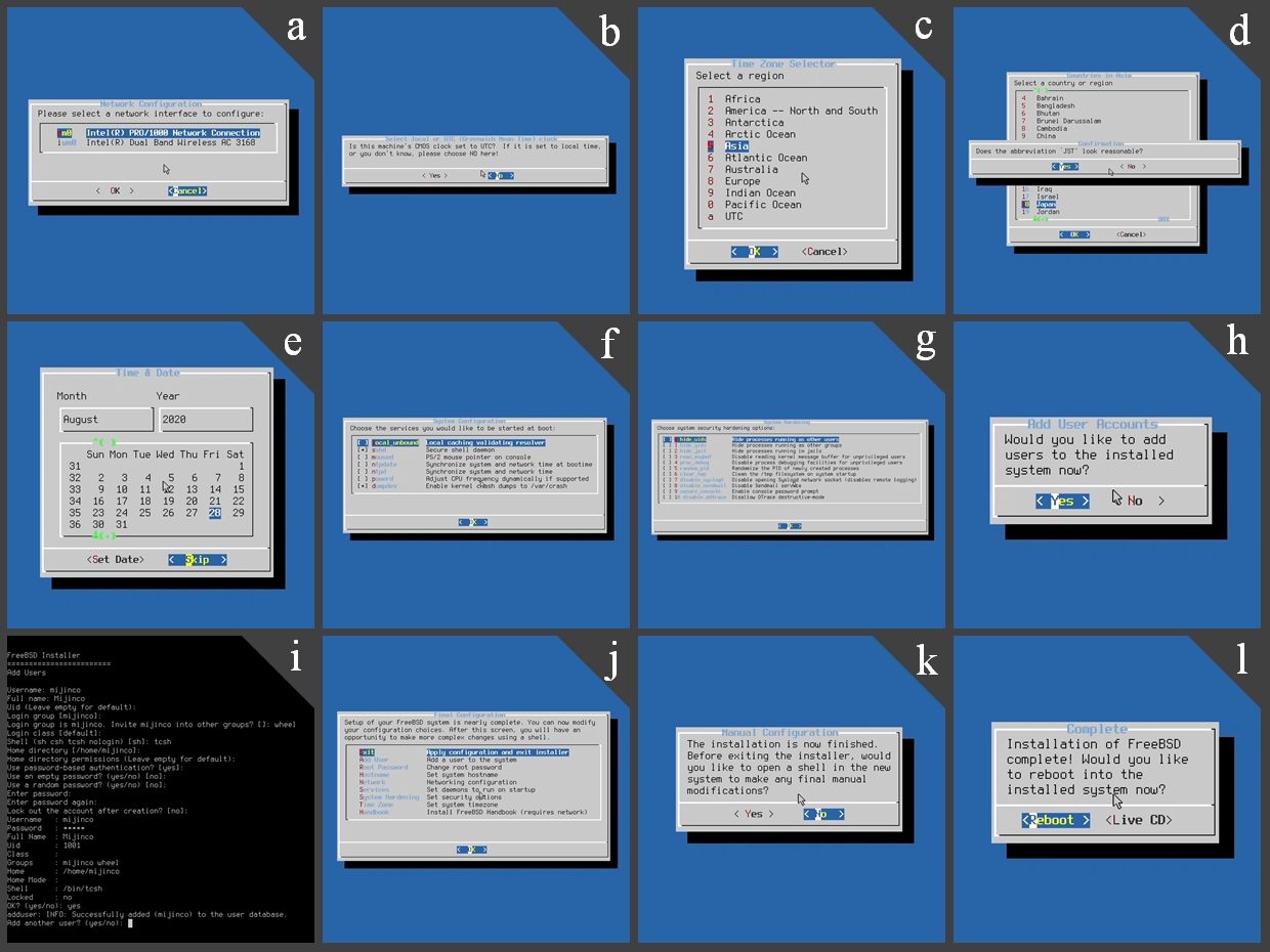 Username: mijinco Full name: Mijinco Login group: mijinco (デフォルト) Invite mijinco into other groups?: wheel operator (空白文字で区切って複数指定可) Login class: default (デフォルト) Shell: tcsh (あとで zsh に変更しようと思う) Home directory: /home/mijinco (デフォルト) Home directory permissions: (空欄) Use an empty password?: no (デフォルト) Use a random password?: no (デフォルト) Enter password: (パスワード入力) Enter password again: (パスワード再入力) Lock out the account after creation?: no (デフォルト) - Final Configuration で [Exit] を、Manual Configuration で [No] を選択する (図 2(j, k))。これで A 面はおしまい。Installation of FreeBSD complete! と表示されるが、我々にはまだ B 面が残されている。[Reboot] を選択して次へ (図 2(l))。