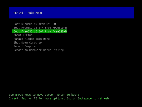 パソコンを起動すると、けっこう長めの「間」ののち、図 3 のように rEFInd のブート選択画面が表示されます (この「間」は UFS ドライバに因るものらしいです) 。refind.conf で "textonly" を指定したので、MS-DOS でも起動しそうな簡素な佇まいですが、私はこのほうが好みです。それぞれの OS がちゃんと起動するか確認しましょう。Windows 10 は見た目ですぐわかるのでいいとして、FreeBSD の A 面 B 面は mount コマンドの出力で確認します。A 面は /dev/ada0p3 が、B 面は /dev/ada0p4 が / にマウントされており、狙いどおりになっています。
