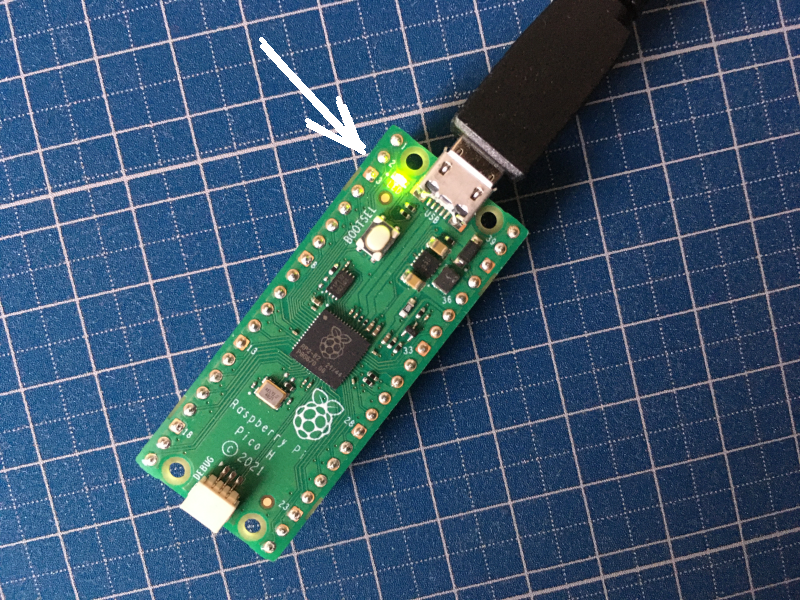blink.uf2 を書き込んでアンマウントすると Pico の LED が点滅を開始します。写真だとわかりづらいかもしれませんが、チカチカしてます。