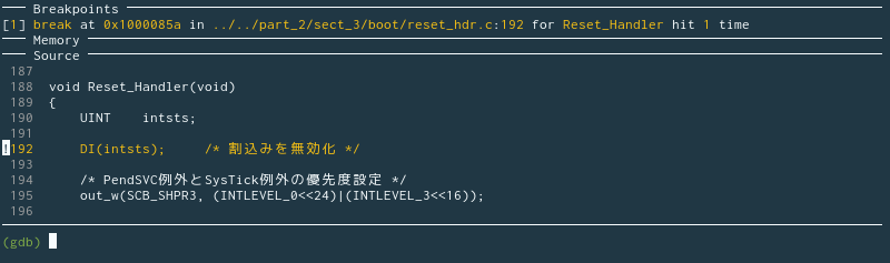 ブレークポイントが正しく設置されていれば、図 1 のように reset_hdr.c の 192 行目、Reset_Handler()の先頭でブレークします。このように、ブレークするたびに GDB dashboard がプログラムの内部状態を表示してくれます。何かの拍子に表示されなかったとしても dashboardコマンドを引数なしで実行すれば表示されます。