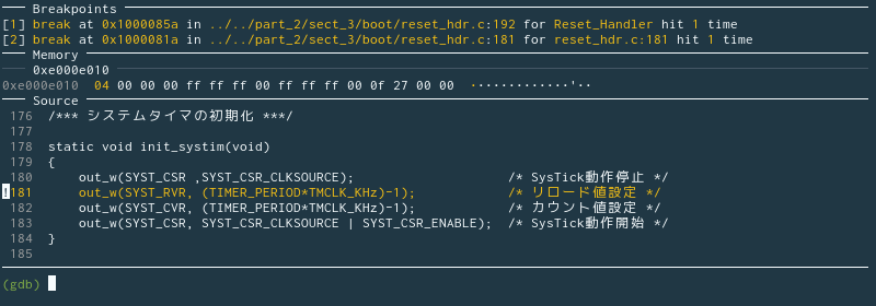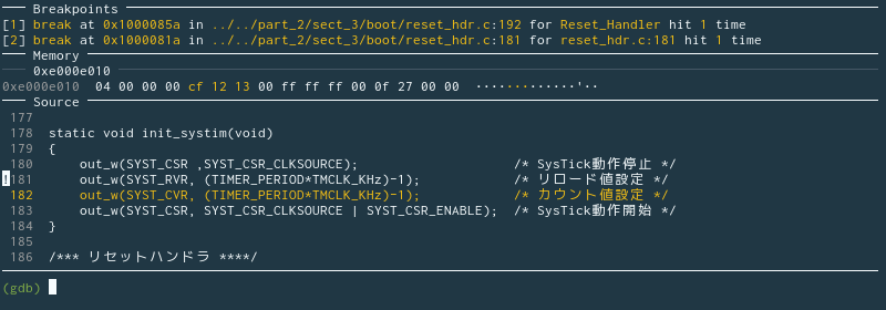 ここで、SYST_RVR レジスタの中身を GDB dashboard で確認できるように設定します。Reset_Handler()の先頭でブレークしている今の状態からプログラムを再開すると、init_systim関数が呼ばれ、その中で SYST_RVR レジスタにクロックカウンタのリロード値をセットしています。その直前の位置にブレークポイントを置きましょう。reset_hdr.c の 181 行目です。