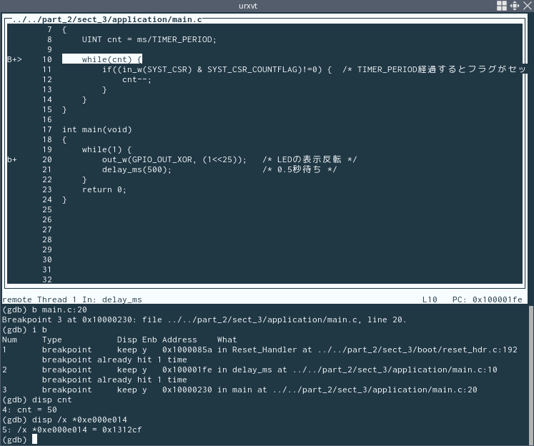 | 8~11 行目: | 新しいコマンドを定義してstartと名づける。GDB を起動してstartコマンドを実行すると、Reset_Handler()の先頭にブレークを張ったうえでプログラムを開始する (その結果Reset_Handler()の先頭でブレークして待機状態になる)。 |