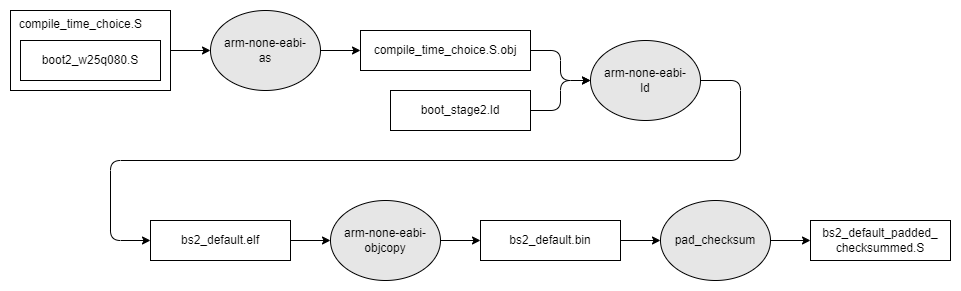 pico-sdk/src/rp2_common/boot_stage2/include/boot_stage2/config.h より引用出典: raspberrypi/pico-sdk (GitHub)#ifdef PICO_BUILD_BOOT_STAGE2_NAME ... #else // boot stage 2 is selected by board config header, so we have to do some work #if PICO_BOOT_STAGE2_CHOOSE_IS25LP080 ... #elif PICO_BOOT_STAGE2_CHOOSE_W25Q080 #define _BOOT_STAGE2 boot2_w25q080 #elif PICO_BOOT_STAGE2_CHOOSE_W25X10CL ... #endif // we can't include cdefs in assembly, so define our own, but avoid conflict with real ones for c inclusion #define PICO_BOOT_STAGE2_NAME __PICO_XSTRING(_BOOT_STAGE2) #define PICO_BOOT_STAGE2_ASM __PICO_XSTRING(__PICO_CONCAT1(_BOOT_STAGE2,.S)) #endif