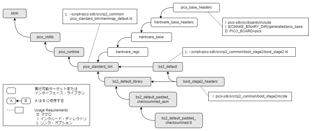 | (*1) | pico-sdk/src/common/pico_base/CMakeLists.txt の 3 行目により pico-sdk/src/common/pico_base/include と ${CMAKE_BINARY_DIR}/generated/pico_base がインターフェース・ライブラリ pico_base_headers の Usage Requirements に加えられる。pico_base_headers の Usage Requirements は前回の「board_setup.cmake でやっていること」に記載した依存関係により blink まで伝播するので、これらのファイルをインクルードすることができる。 |